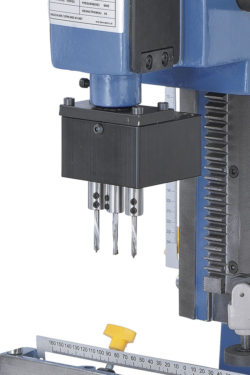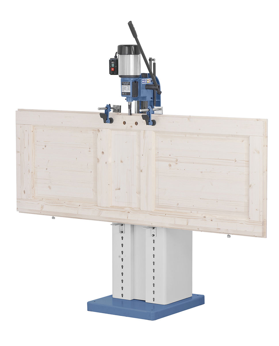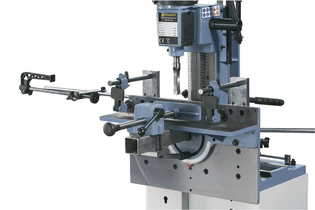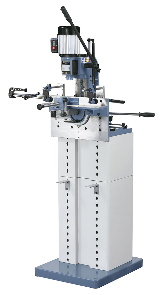 Porapää liikkuu sivusuunnassa. Työpöytä kallistuu ja koneen vakiovarusteisiin kuuluu umpinainen jalusta.Tämä malli on suunniteltu ammattikäyttöön.
