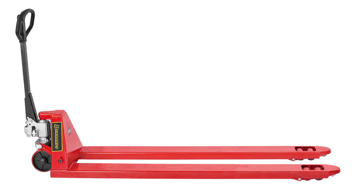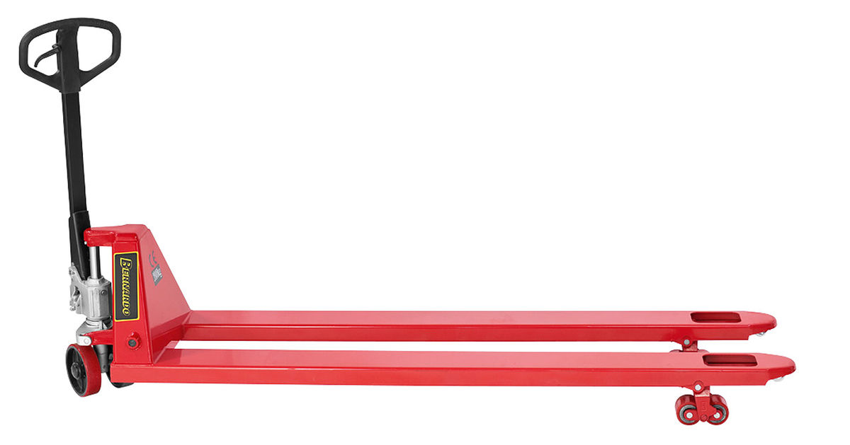 Pitkillä 2,0 m haarukoilla varustettu pumppukärry.Todella kätevä pitkien lavojen tai kappaleiden siirtämiseen.