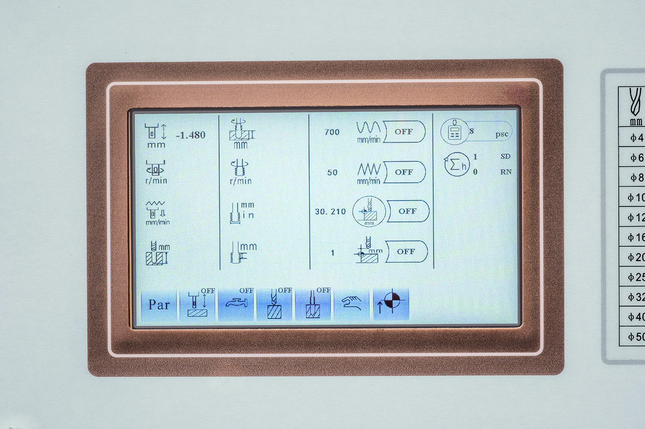 - Suuri kosketusnäyttö kaikkien säätöjen ja toimintojen hallintaan (esim. poraus, syväporaukset, kierteitys jne.)