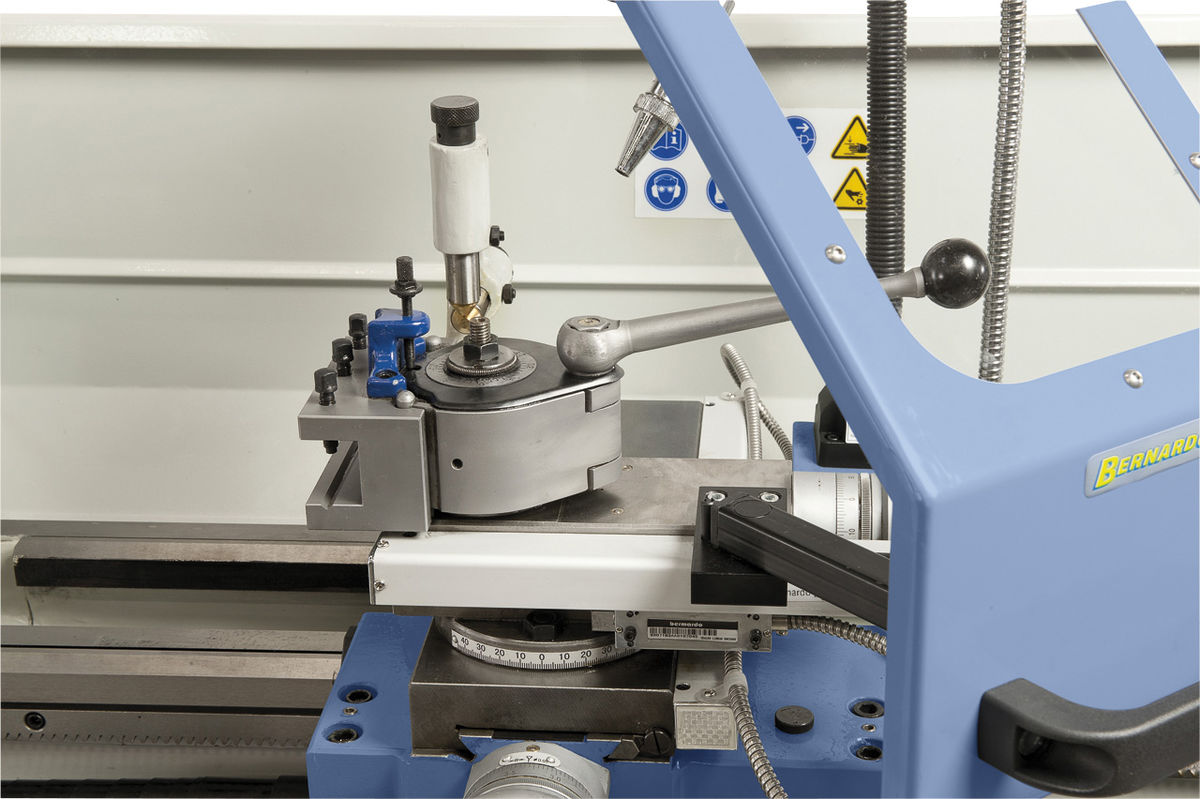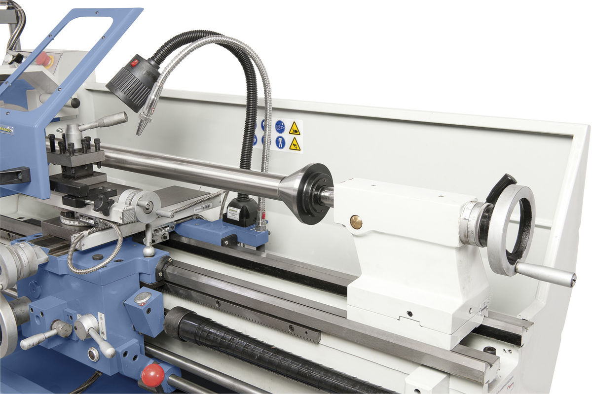 - Säädettävä takapylkkä kartiosorvaukseen, käsipyörä, jossa säädettävä mitta-asteikko (0,04 mm)