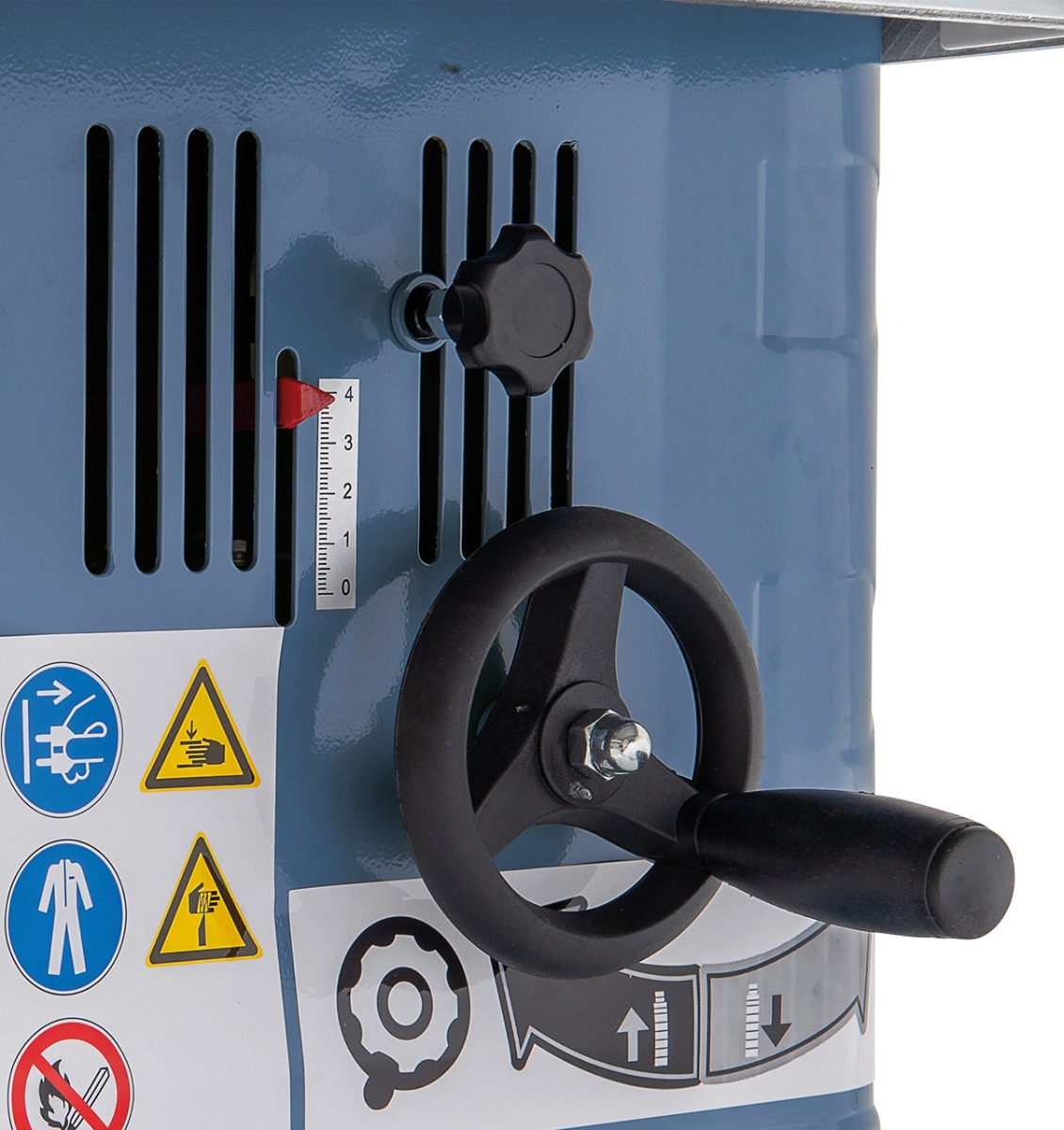 - Jyrsinkaran korkeussäätö käsipyörällä, helppolukuinen asteikko