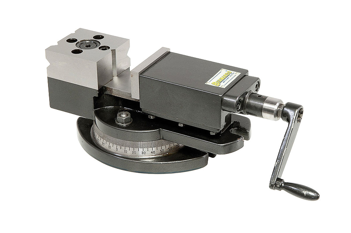 Yleisruuvipuristin joka kääntyy aluslevyn ympäri sekä toinen leuka on käännettävissä.