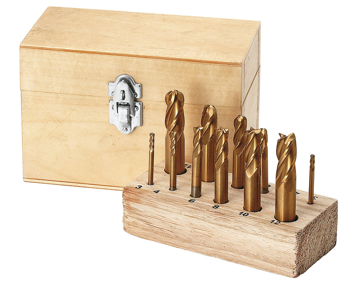 Tin-pinnoitettu 12-osainen Combi jyrsinteräsarja. Koot 3 – 12 mm.Terät on pakattu puulaatikkoon.