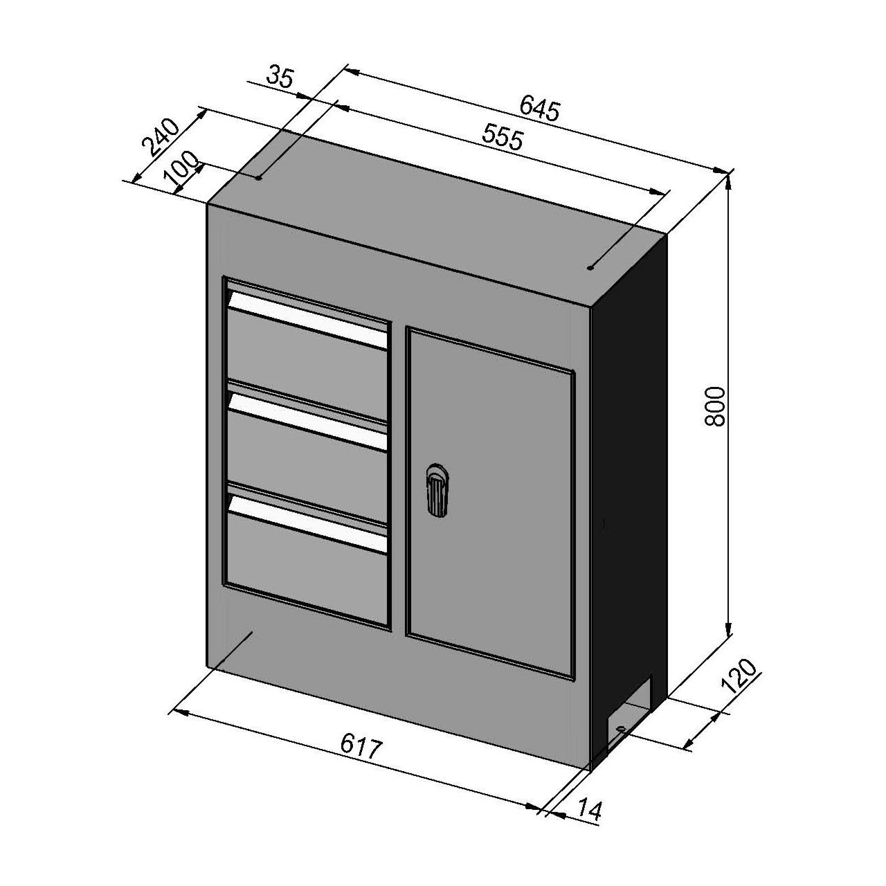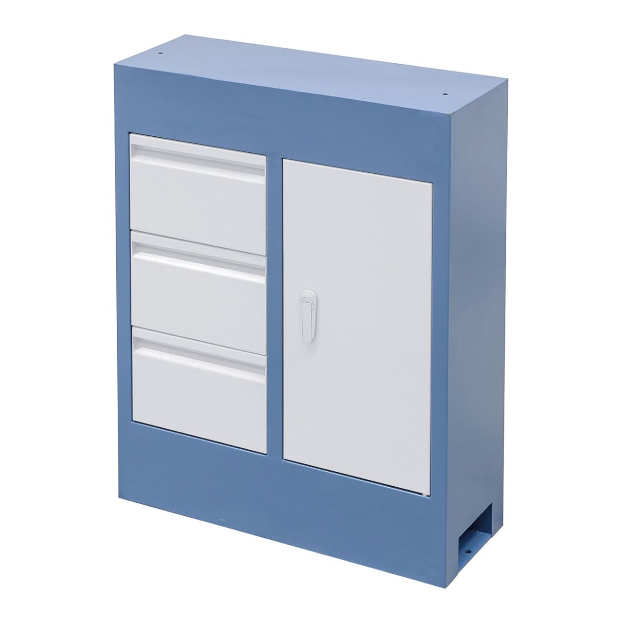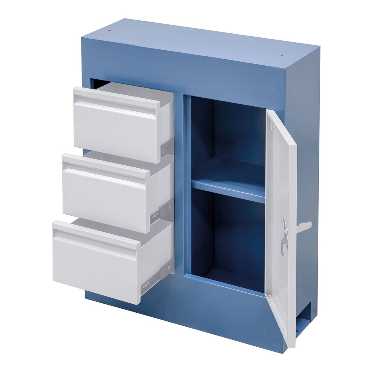Laadukas jalusta minisorveille jossa laatikot ja kaappi.