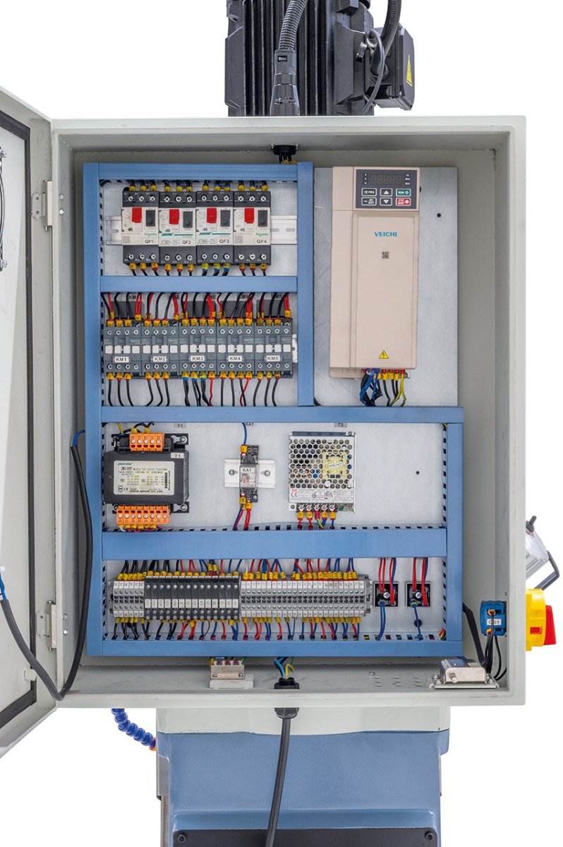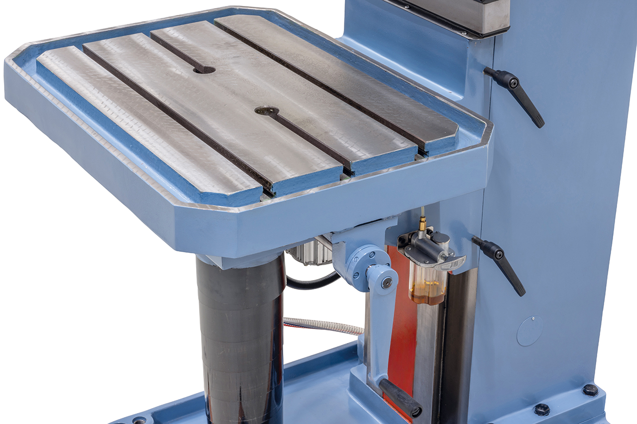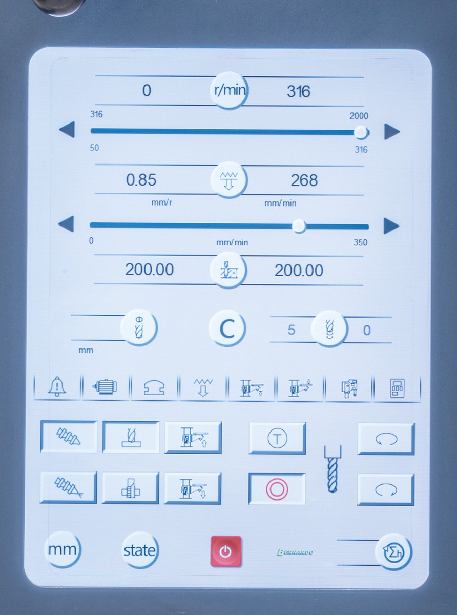 - Vakiona Bohrtronic-ohjaus joka laskee ihanteellisen porausnopeuden tai syöttönopeuden poraukseen ja kierteitykseen terän halkaisijan ja materiaalin perusteella (valurauta/teräs)