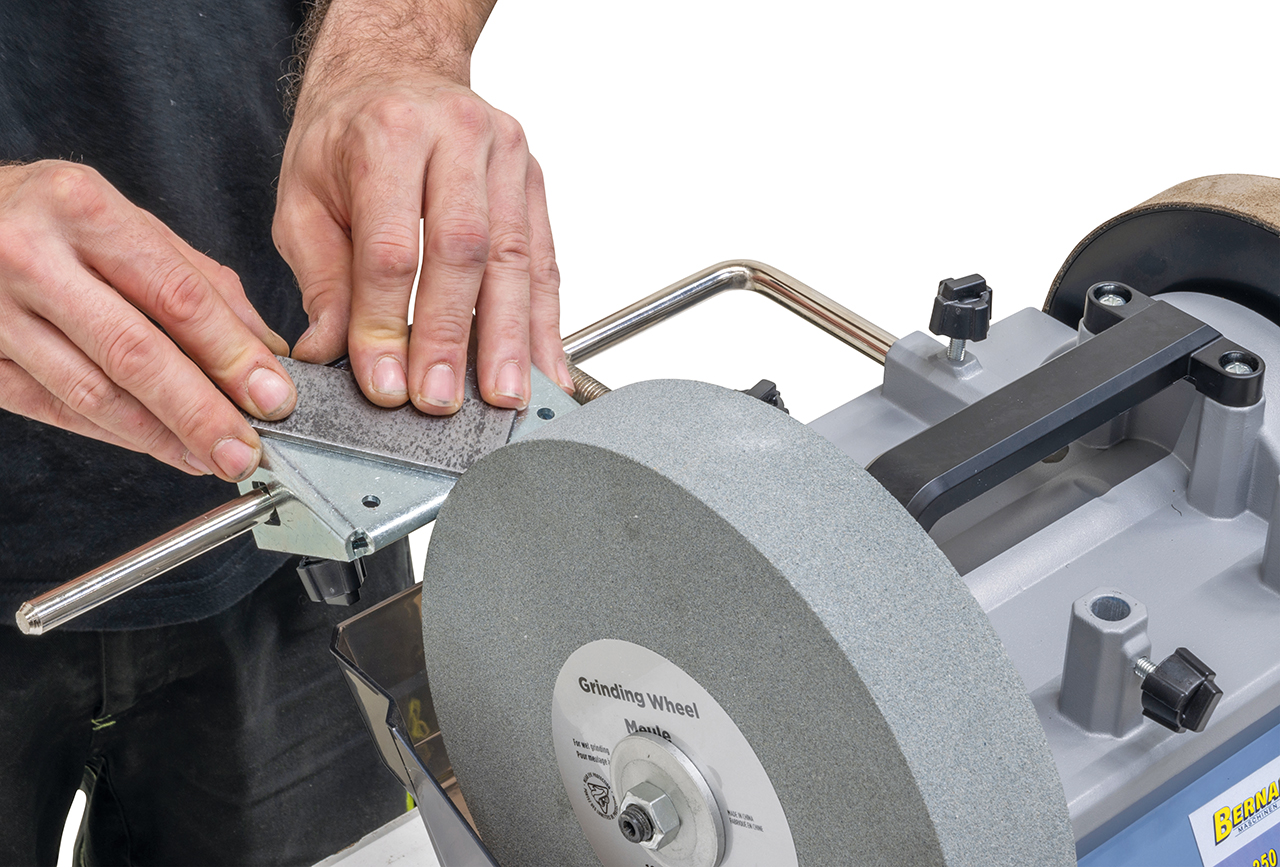 Hiomakone nauhalla ja hiomakivellä
